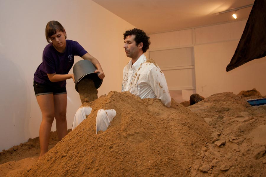 The exhibition attempts to overturn the conventional order associated with the exhibition of art. Rather than presenting the conclusion of the artistic process – the moment in which the creative act ends and the work is complete – it highlights the creative process and the work’s evolution, in an attempt to introduce viewers into the artist’s private world and to involve them in his or her personal quest. Another central concern in the exhibition is the tension between traditional art forms, which are unchanging and seemingly eternal, and between performance art, which is bound by the limits of a specific time and place. The exhibition’s schedule of events and performances has been similarly adapted to the process unfolding in the museum space. Unique events took place once every two weeks, while the traditional opening night was replaced by an evening of performances on August 26, which marked the exhibition’s closing.