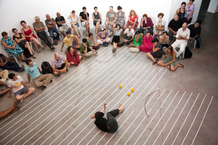 The exhibition transforms the concept of the Island into a tool for examining the limits and status of the museum and of performance art in the context of contemporary reality. The seven performance artists that participated in the exhibition took over various museum spaces, while simultaneously sharing their ongoing work processes. Viewers, who were welcomed at the museum during its regular opening hours, were invited to explore concerns including the museum’s role as an isolated cultural “lighthouse” or ivory tower, the limits of the museum as an institution, and the status of the artwork (if artworks indeed emerge out of the work process) as an organic, vital and unique entity.