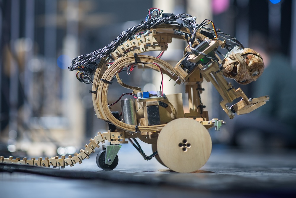 The exhibition came about through a process that started in 2009 when Drori began developing mechanical animals for the show Savanna, in collaboration with designer Noam Dover. The process continued through another collaboration, this time with artist Ofer Laufer on the show Monkeys developed at Bat Yam’s Fest’Factory creatives hub. The animals are painstakingly handcrafted over hundreds, at times even thousands of hours. In this type of extensive and thoughtful work process, a unique relationship is formed between the creator and his creation, imbuing it with profound meaning. Initially, the animals’ operating mechanisms were hidden, creating a naturalistic appearance. However, over time, the operating mechanisms – the animatronics’ anatomy – started to surface: the engines are the muscles; the controllers are the brain; the wiring system stands for the tendons, veins, and nervous system. This duality between the mechanical and the figurative allows us to shift and alternate between the animal and the machine, between the natural and the artificial, and to be swept away by the magic of Amit Drori’s enchanting and mysterious world.