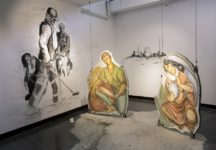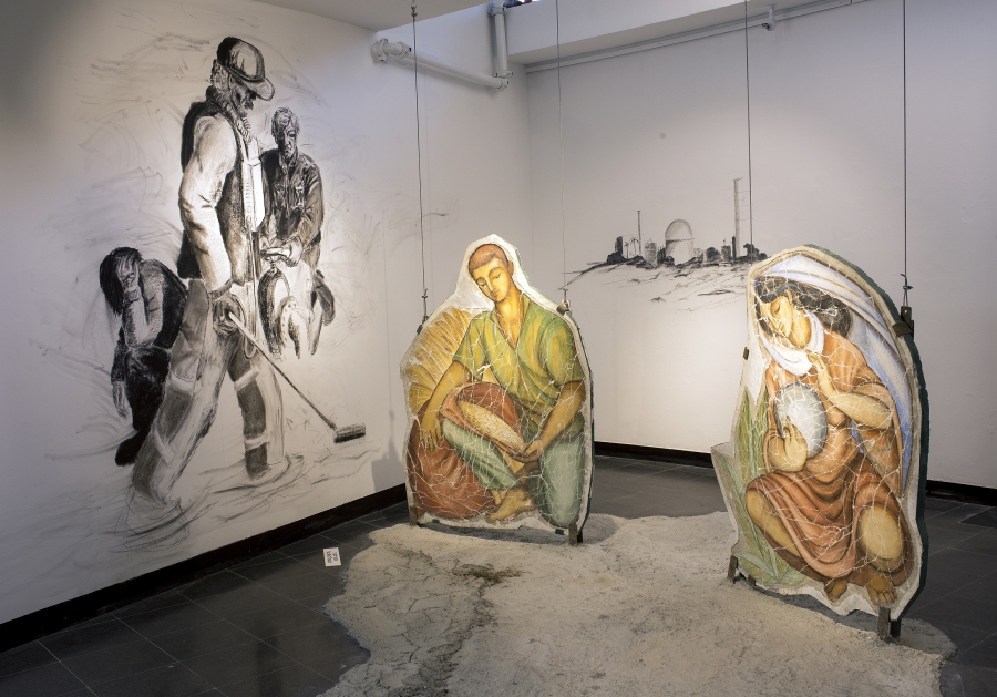 Mati Lahat exhibits “Titans”, an installation created especially for the exhibition and composed of original frescoes created by Shraga Weil and Shmuel Katz in the communal dining hall of Kibbutz Ein Hamefratz in 1954. Lahat rescued the frescoes before the dining hall wall was destroyed. At MoBY he presents them against graphite drawings of the Liquidators monument in the Ukraine. These volunteers sacrificed their lives to seal the nuclear reactor at Chornobyl with concrete in 1986 in order to prevent further leakage of radioactive radiation.