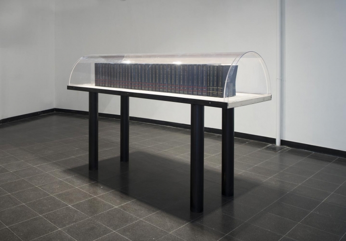 Nicole Wermers presents a modular bookcase she has designed especially for the exhibition, displaying a 1970s edition of The Great Soviet Encyclopedia – the Soviet answer to Britannica. Today, the knowledge accumulated in the encyclopedia seems to be irrelevant and obsolete. Throughout the year, artists, researchers, writers, curators, and others are invited to interpret contemporary events and affairs using terms glossed in the encyclopedia.
