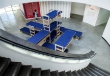 On the second floor, Raanan Harlap presents Public House – a wall relief of an apartment inside the museum, which turns the building inside out like a pocket – the interior is made exterior and vice versa. When we look at the windows and shutters, which we associate with a public housing architectural style, our perspective is inverted and it’s as if the wall becomes transparent.