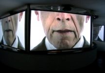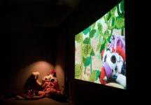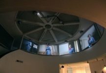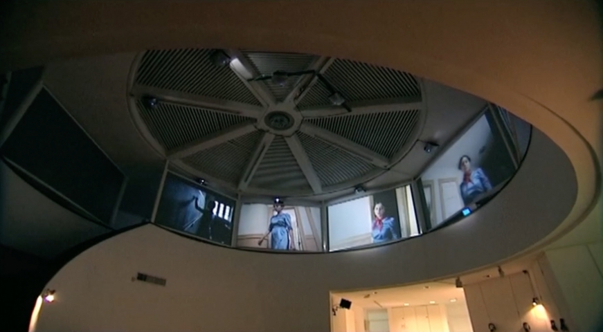 One element that runs through the entire exhibition is the treatment of the museum space as a mansion – a giant, modernist, roundhouse and a sort of “little brother” to the Guggenheim in New York, built during the same era. The museum entrance leads into the upper space of the exhibition, where one may find the children’s quarters – a space in which “everything goes”: a fanciful room by Gil Yefman; a translation of poetic/erotic texts into sign language by Romy Achituv and Orit Kruglanski; Tal Shoshan’s choreography of invented signs to the song “Badad” (Alone) by Zohar Argov; a ventriloquist act by Imogen Stidworthy; or Chaplin’s speech from “The Great Dictator” signed by a headless orator, in the work by Jordan Wolfson. Further on in the upper complex of the exhibition, Trixi Weis’s traffic signs direct the visitor’s attention to the act. Between the upper space and the downstairs parlor in a spiral of eight “windows”, the video work of Ira Eduardovna tells a story that takes place in different landscapes and in which the artist is given written and spoken instructions that ultimately lead her nowhere.